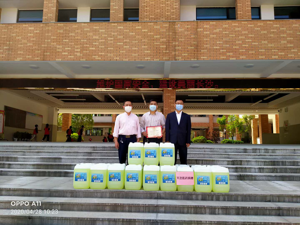 4月28日上午,天勁醫藥行政后勤部載著數十桶消毒液駛入了長沙醫學院,受到了其校長、附屬醫院副院長、藥學院院長等的熱情接待,并舉行了捐贈儀式,表達對公司的誠摯謝意。長沙市一中金山橋學校教務主任代表學校接受了捐助,表示會物盡其用,保障師生的健康安全。